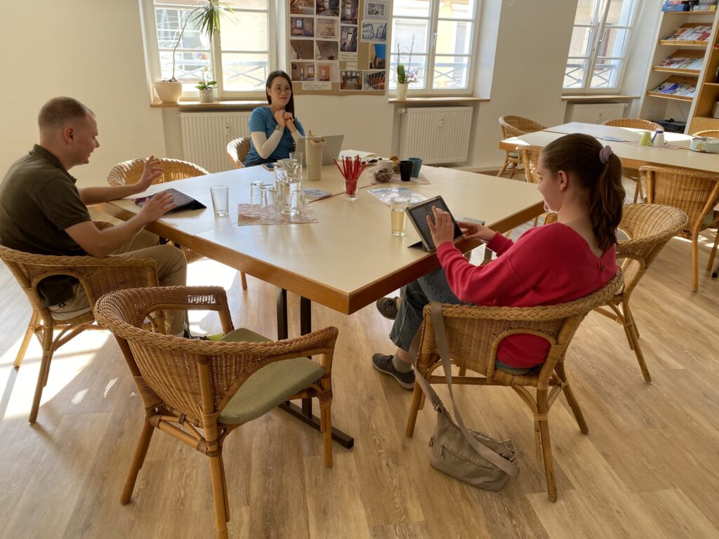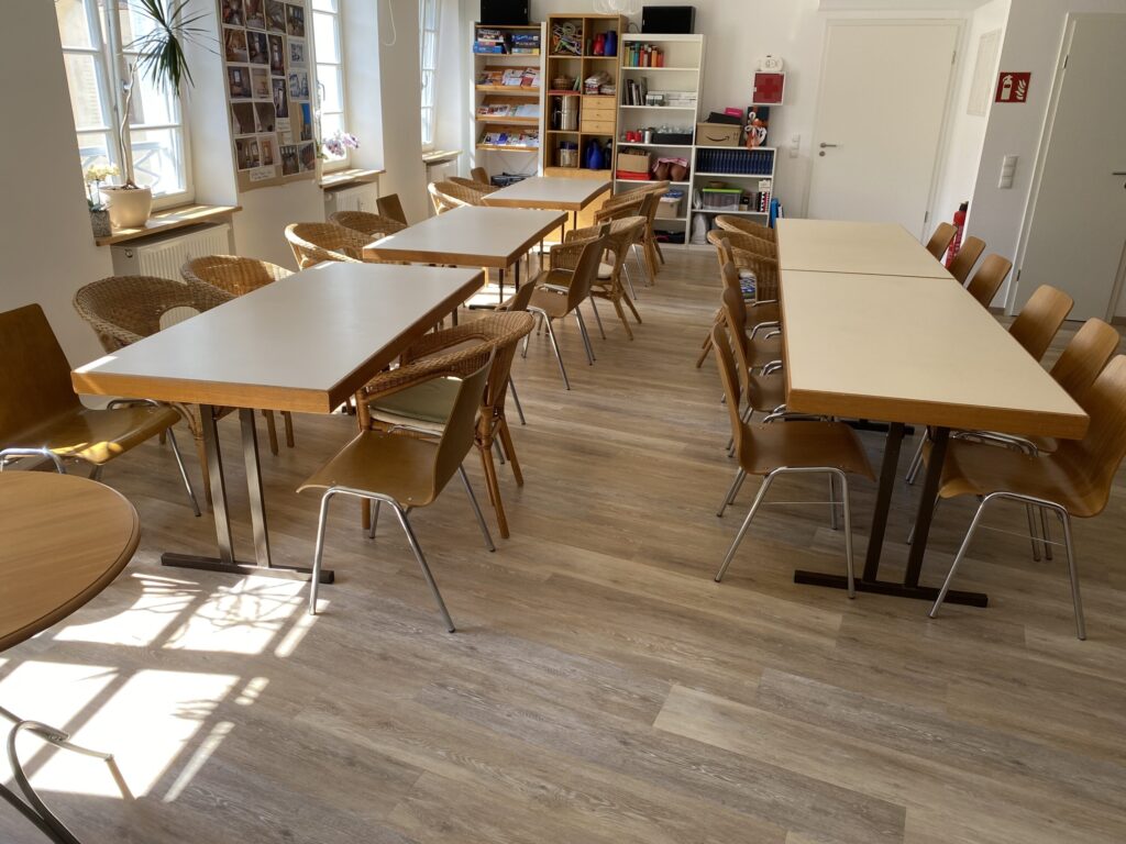 Ausstattung: Stühle und Tische (goße und kleine) vorhanden. Die Tische können je nach Bedarf für größere oder kleinere Arbeitsgruppen flexibel aufgestellt werden.